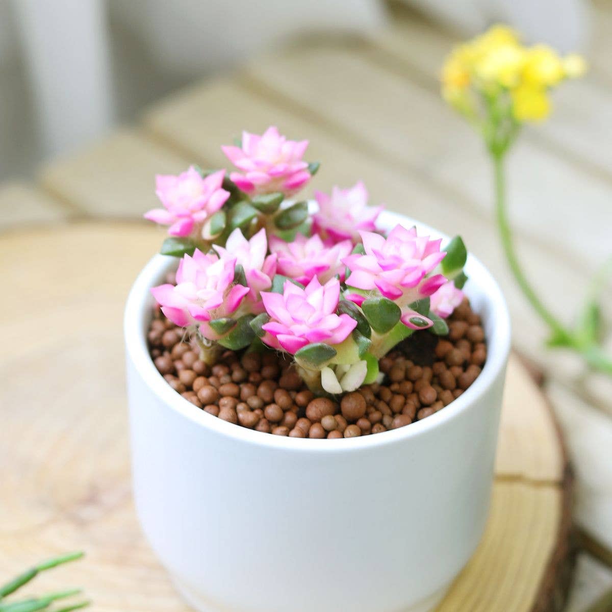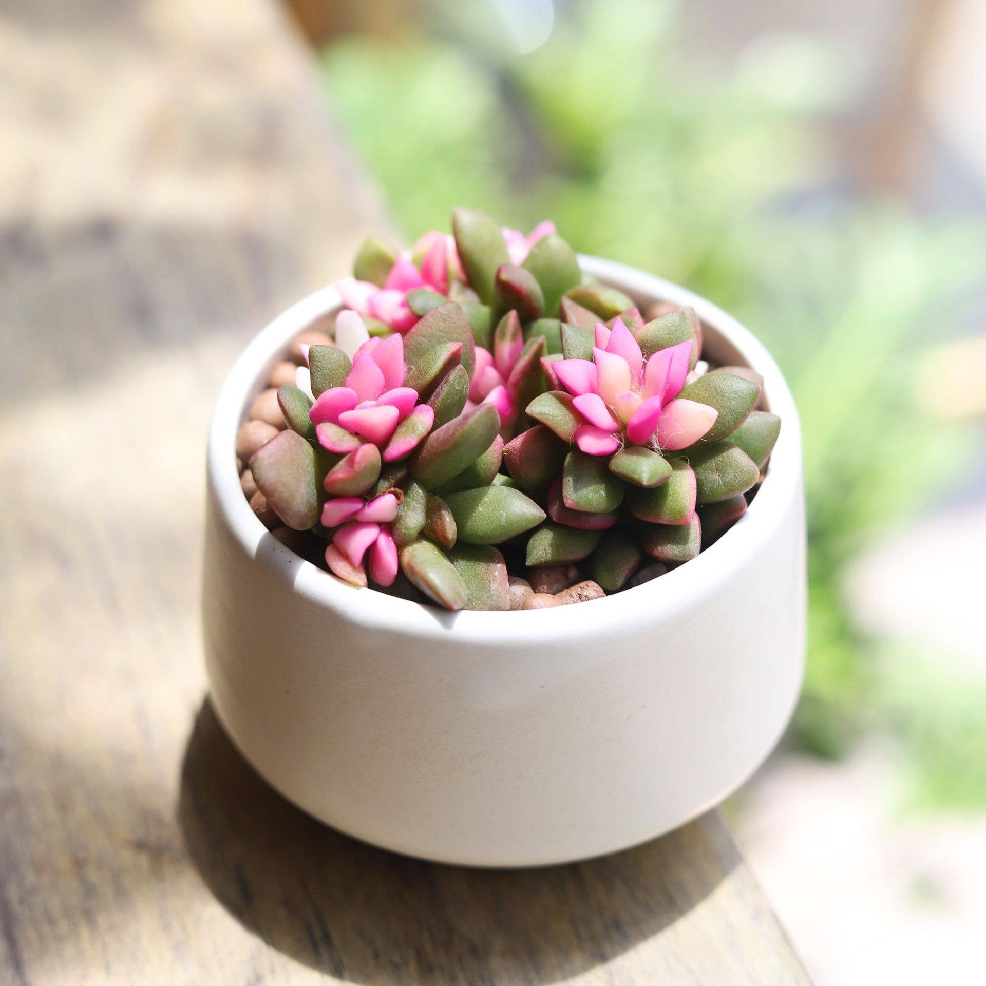 Anacampseros Telephiastrum 'Sunrise' is a dense mat and caudex forming succulent up to inches (15 cm) tall, with lanceolate shaped green, bright pink and yellow or cream colored leaves. They can be grown compact as rosettes, but with time they start go grow longer and longer and offsetting to create a dense mat or trail over the edge of pots. With age they also can form a small caudex as the base of the plant, but because of how very slow growing they are this takes a very long amount of time. Flowers are pink and up to 1.4 inches (3.5 cm) in diameter and appear in afternoon in summer.
