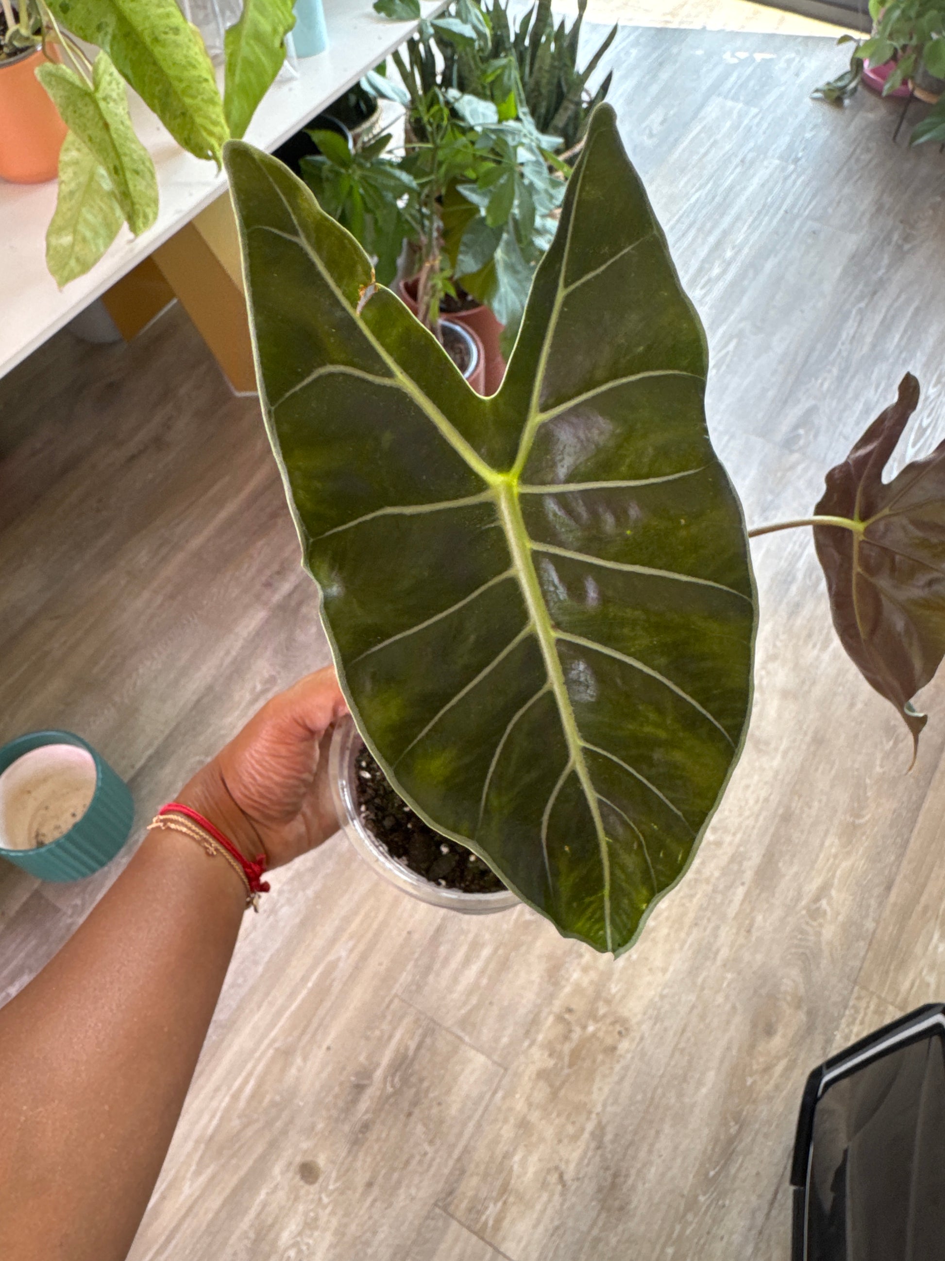 Alocasia Dragons Tooth Longiloba captivates with its striking green leaves, highlighted by bold white veins and a distinctive rippled texture. This unique indoor plant adds a touch of exotic elegance to any space while thriving in medium indirect light. Easy to care for, it’s perfect for those seeking a low-maintenance yet visually stunning addition to their home or office. Elevate your plant collection with this remarkable beauty.